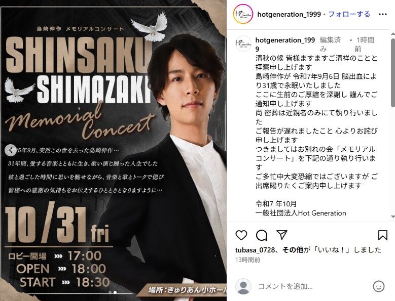 @livedoornews【訃報】俳優・島崎伸作さん、脳出血で死去 31歳 news.livedoor.com/article/detail… 島崎さんが9月6日に亡くなったと6日、ホットジェネレーションが発表した。31日にお別れの会「メモリアルコンサート」を実施する。島崎さんは『レ・ミゼラブル2021』ジョリ役、現代版『坊っちゃん』主演などで知られる。 pic.x.com/nFMCdCkRLz